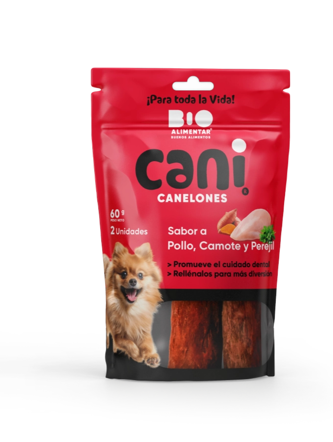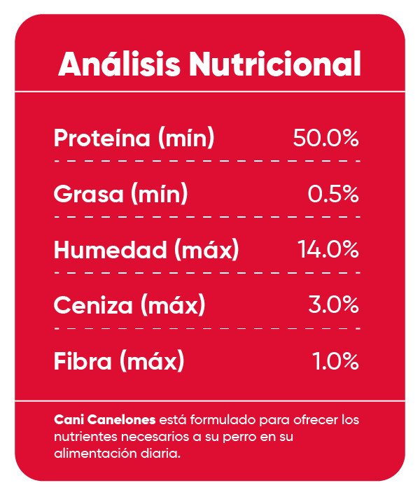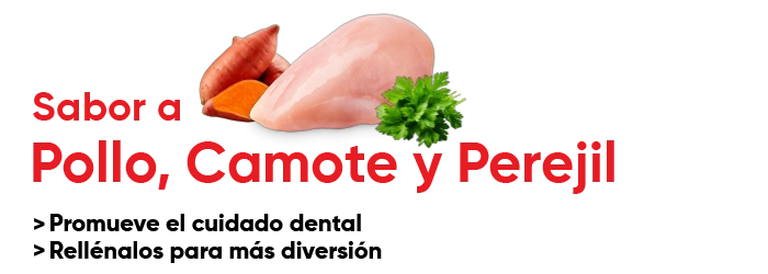 Ingredientes:Carnaza de bovino, pollo, camote, perejil, carragenina, glicerina, sorbato de potasio y ácido cítrico.