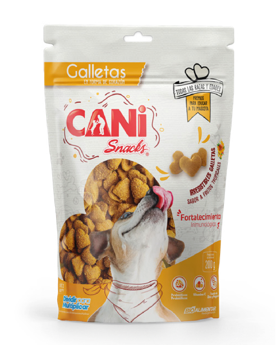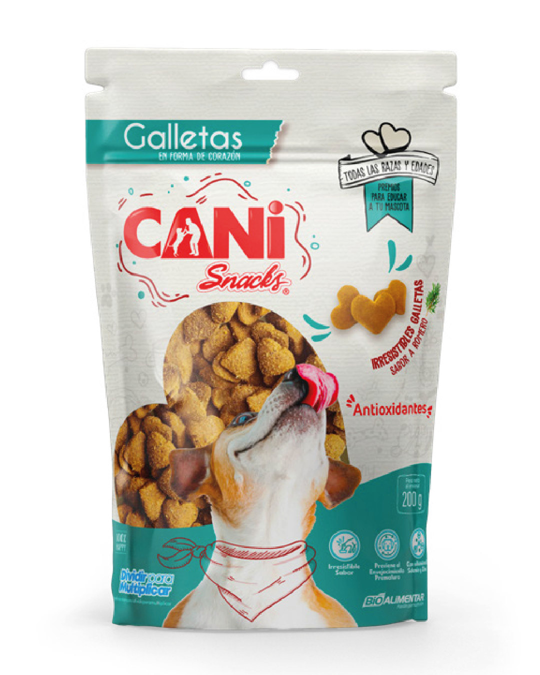 Ingredientes:Galletas Snacks en forma de corazón para mascotas (perros), con vitamina C, Zinc y Magnesio. Cuenta con Prebióticos y Probióticos que refuerzan el sistema inmune e impiden el ataque de microorganismos.